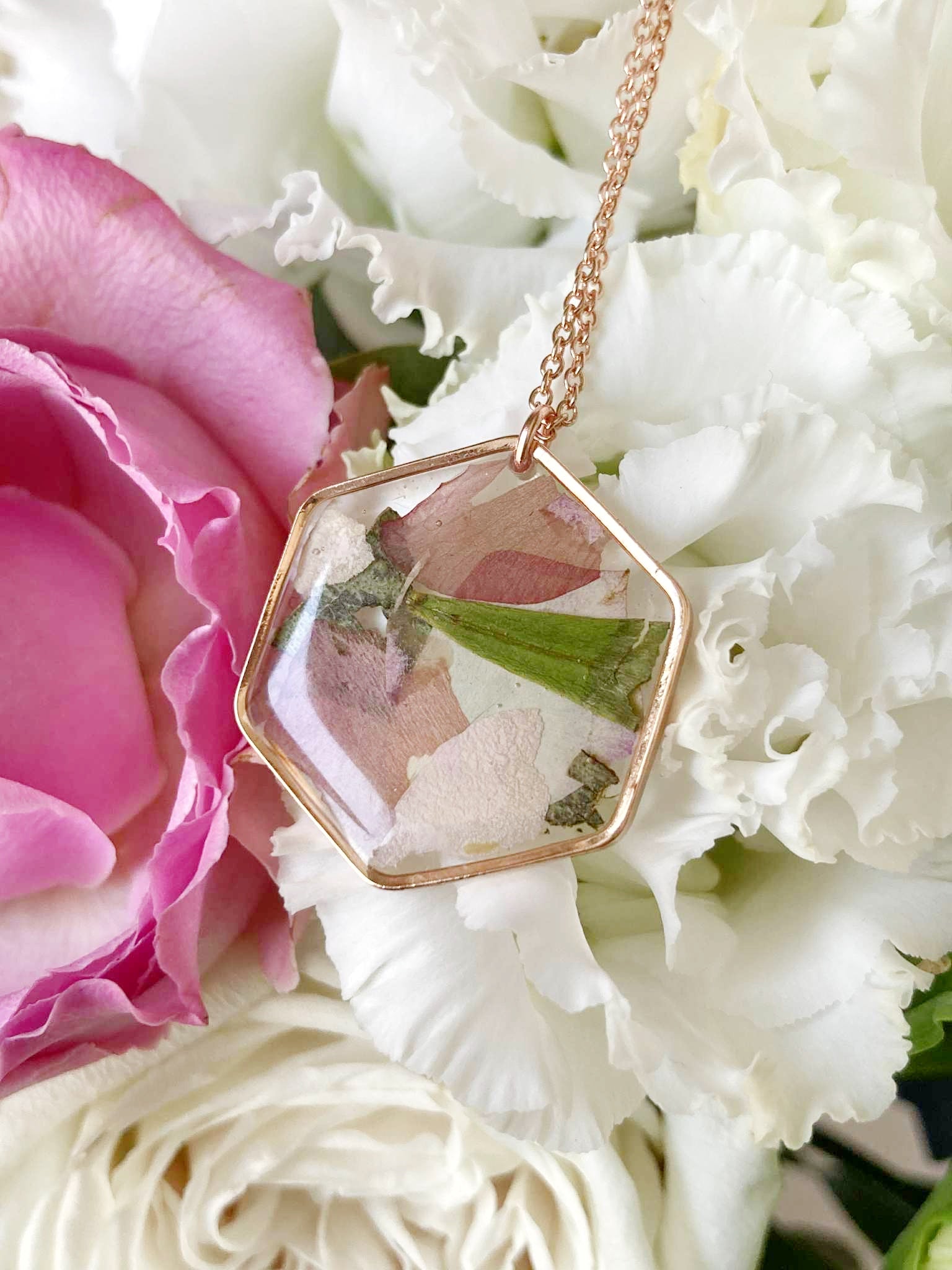 Personalisierter Schmuck aus deinen eigenen Blüten. Dazu werden kleine Stücke einzelne Blütenblätter getrocknet und in Kunstharz eingegossen.