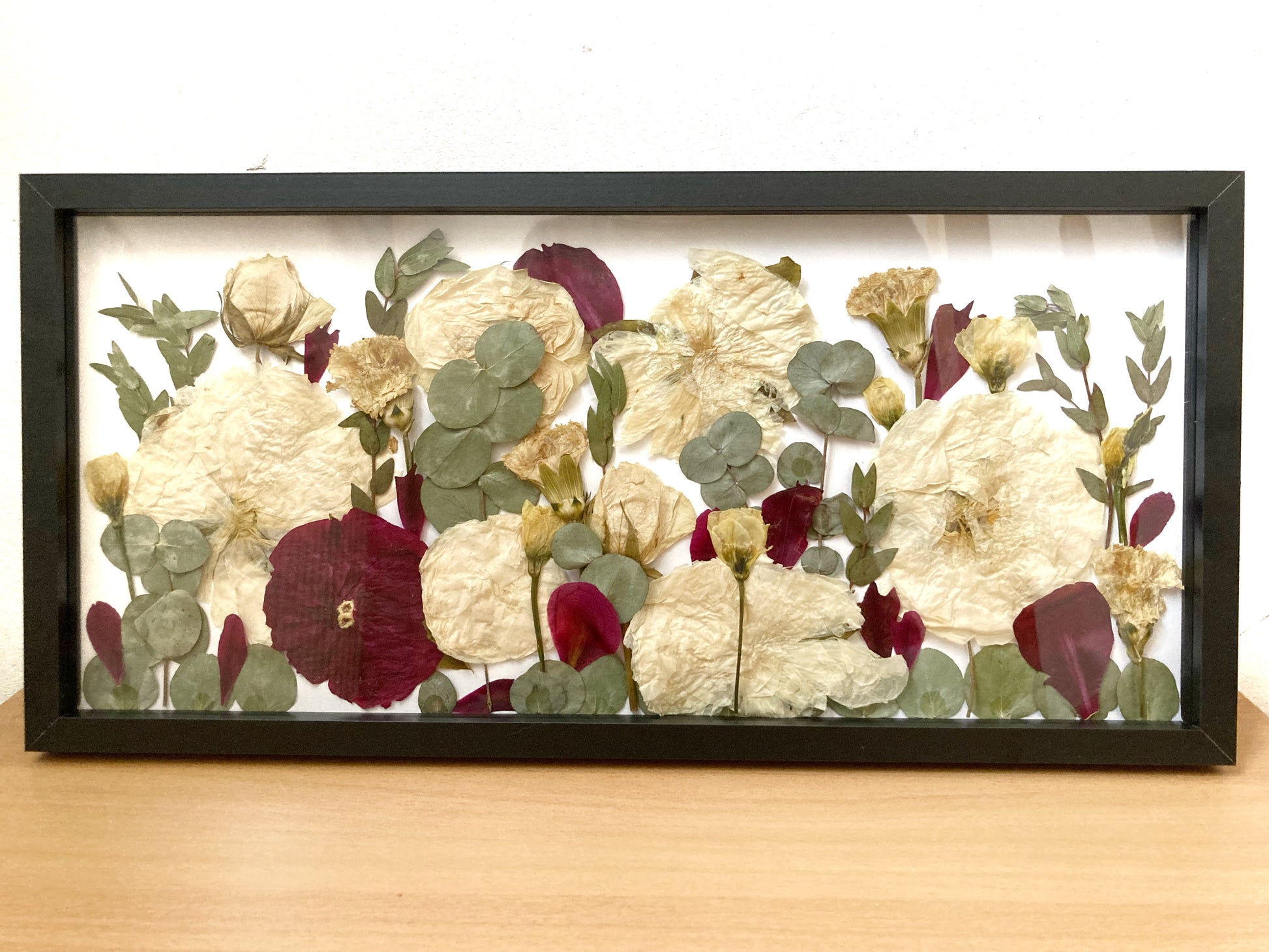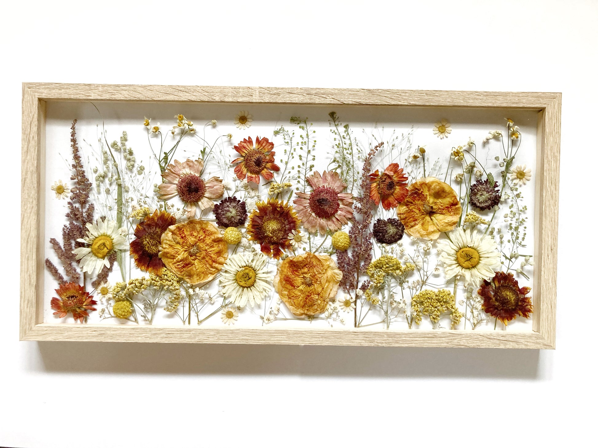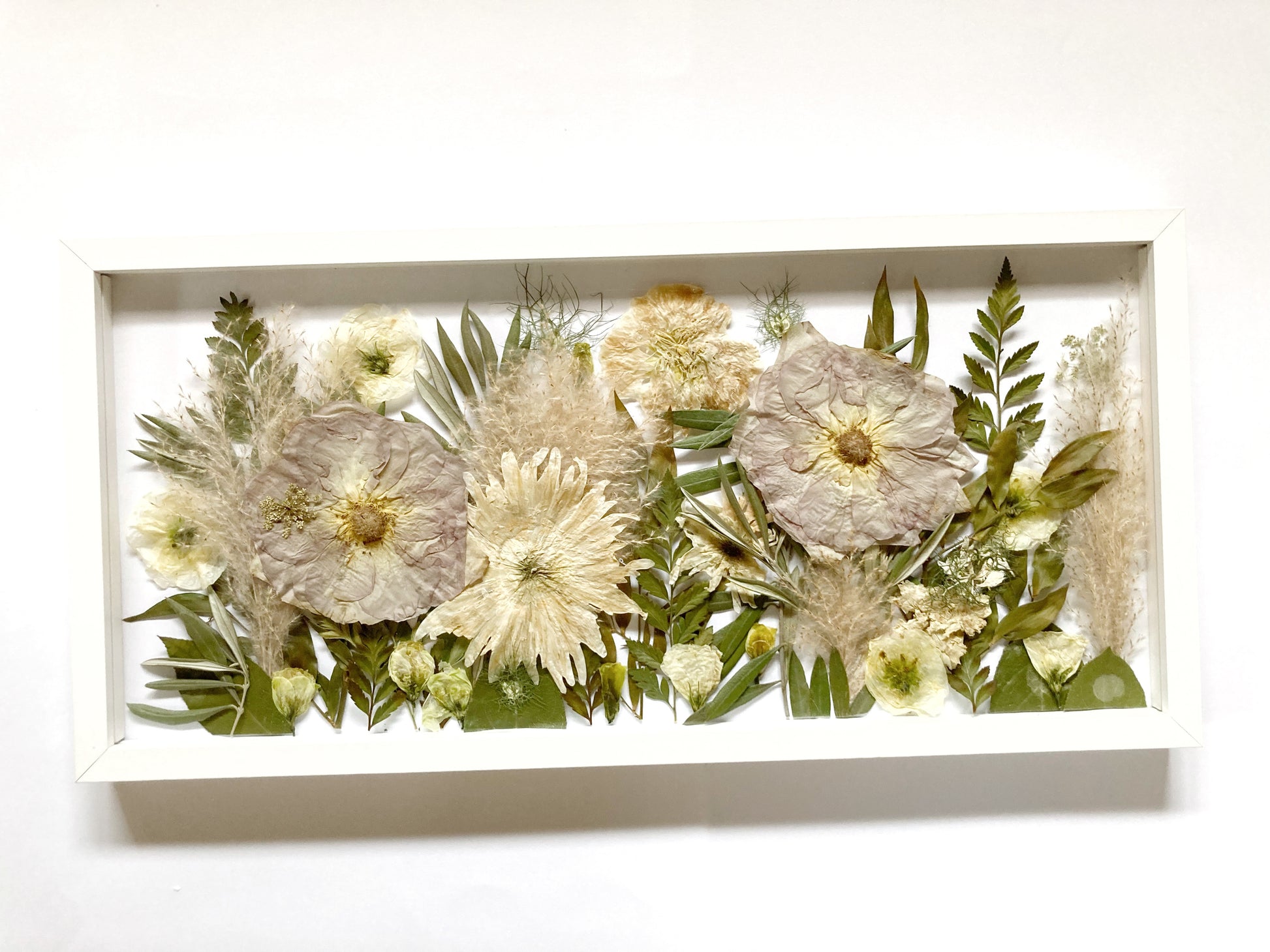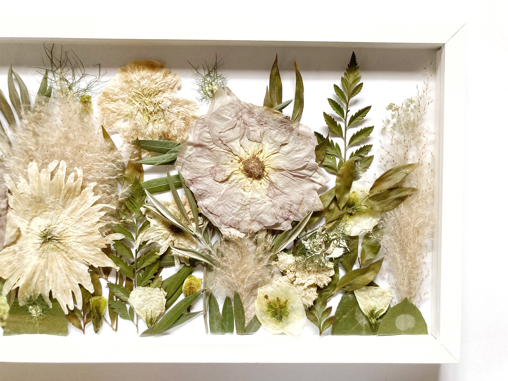 Die einzelnen Blüten werden gepresst und hinter Glas eingerahmt. Die Rückwand ist weiß.