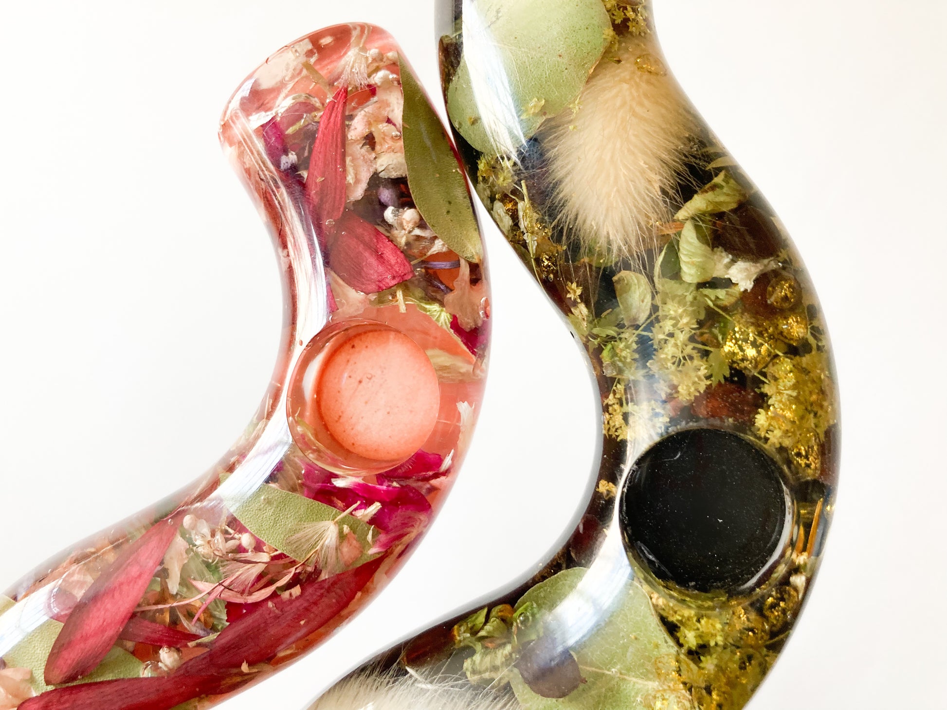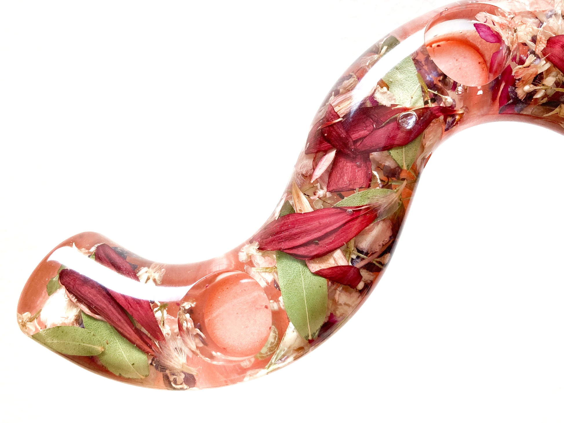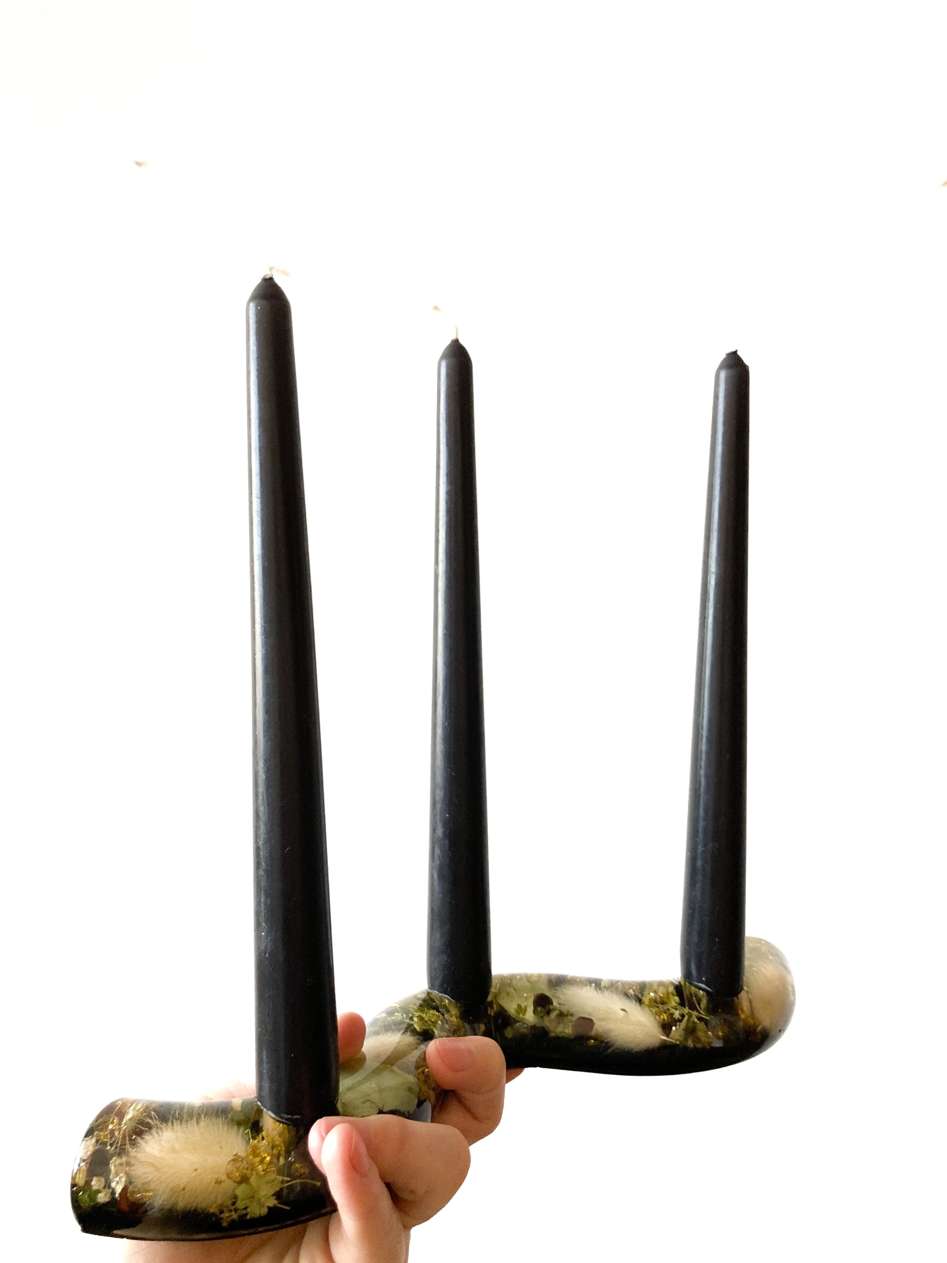 Dieser wellenförmige Kerzenhalter bietet Platz für drei Stabkerzen. Kleine getrocknete Blüten und Blütenblätter sind dafür in klarem Kunstharz eingegossen. Die Unterseite kann mit färbigen Kunstharz gefüllt werden, um zB die Farbe der Blüten noch mehr zu betonen. Bläschen können sichtbar sein.
