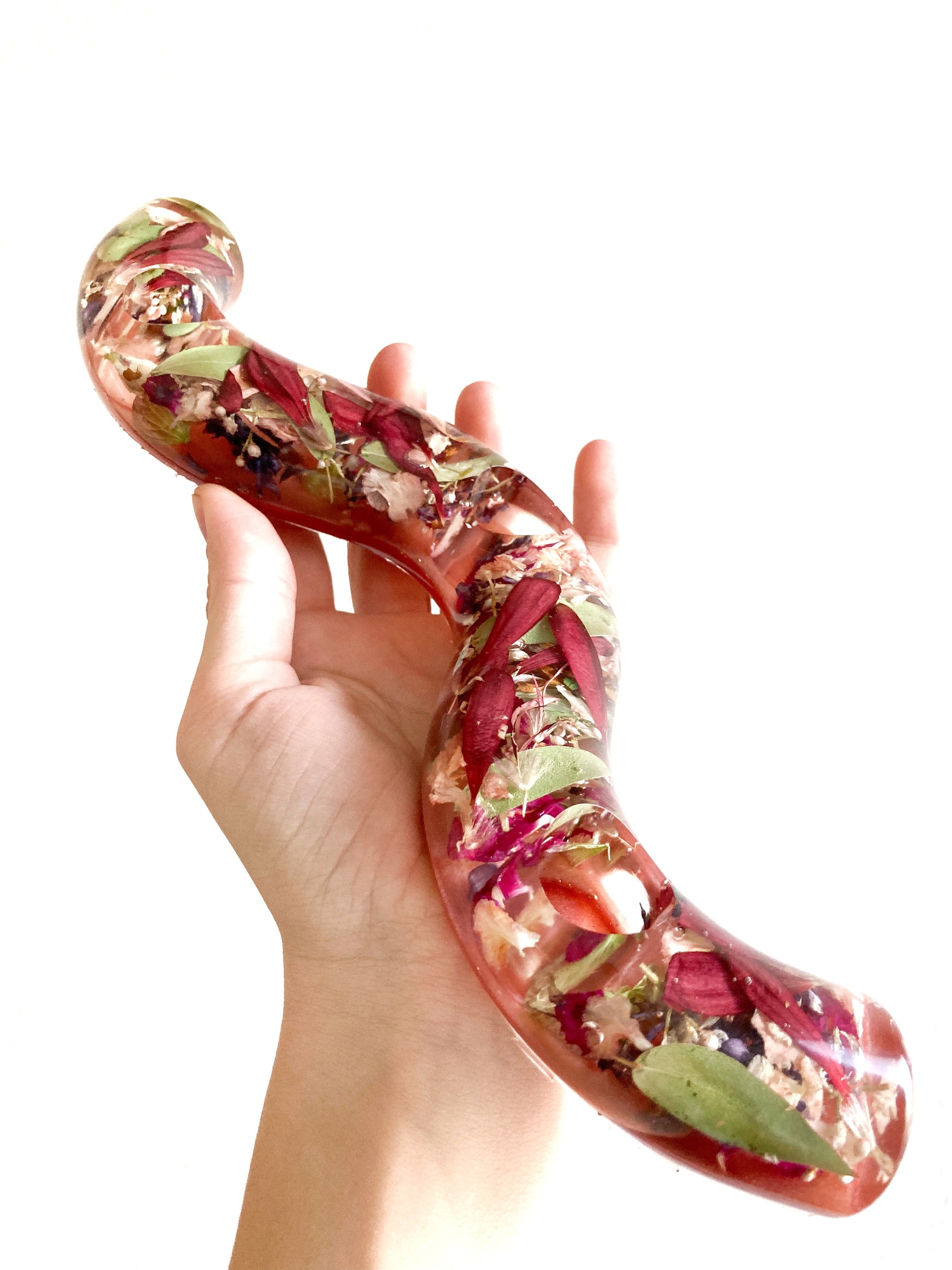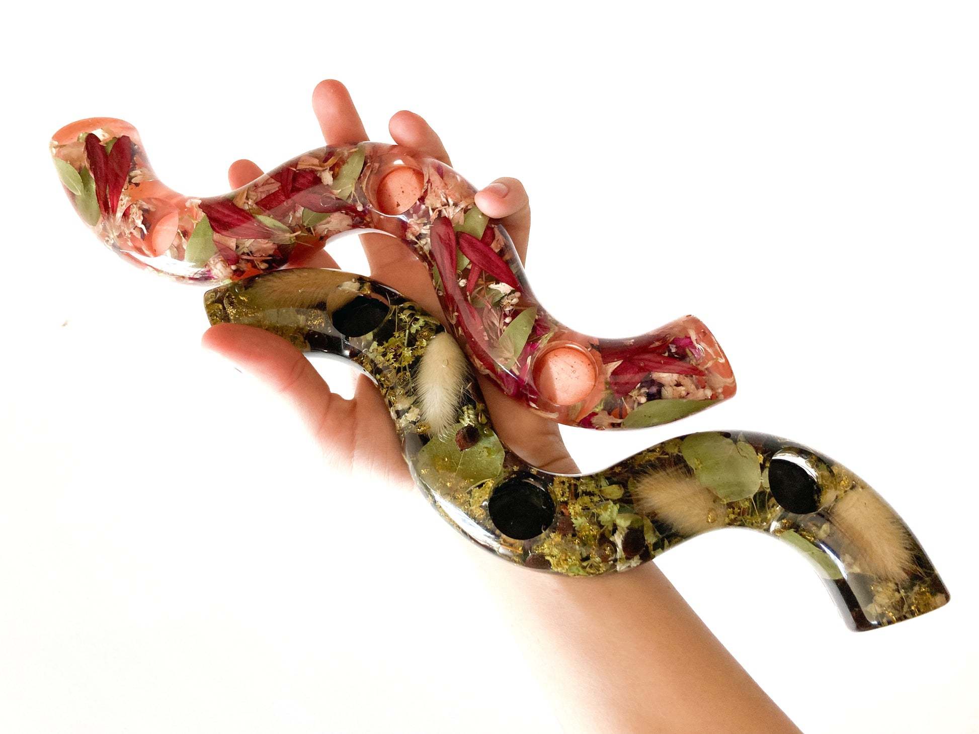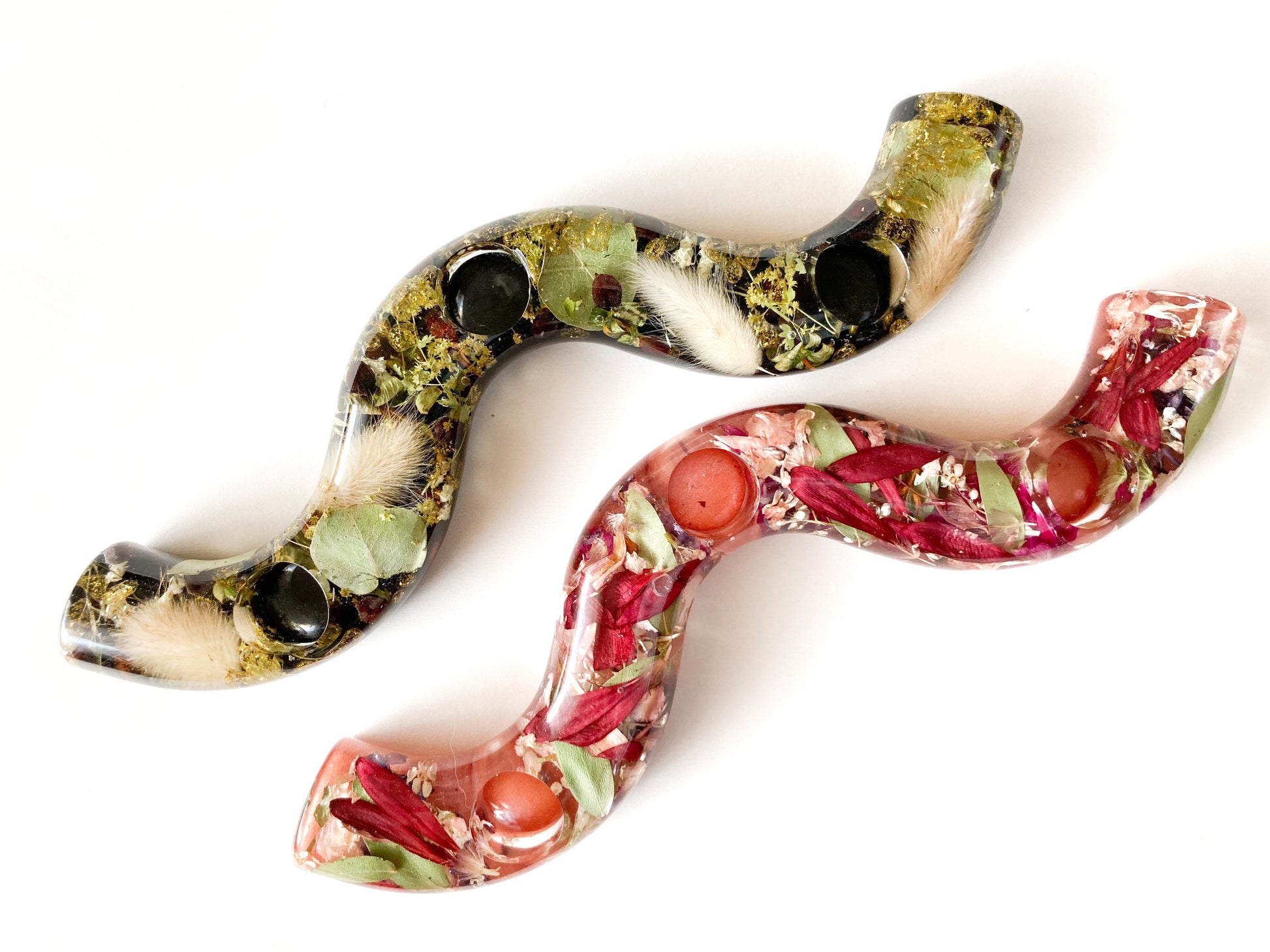 Dieser wellenförmige Kerzenhalter bietet Platz für drei Stabkerzen. Kleine getrocknete Blüten und Blütenblätter sind dafür in klarem Kunstharz eingegossen. Die Unterseite kann mit färbigen Kunstharz gefüllt werden, um zB die Farbe der Blüten noch mehr zu betonen. Bläschen können sichtbar sein.