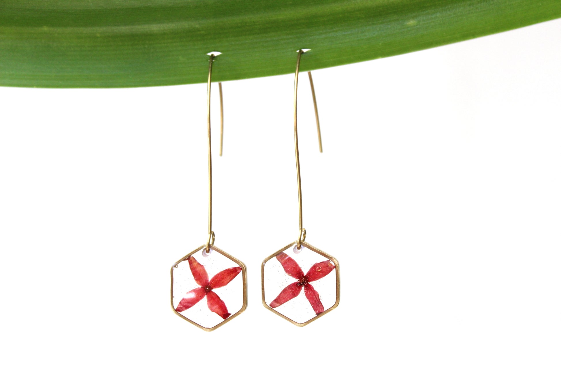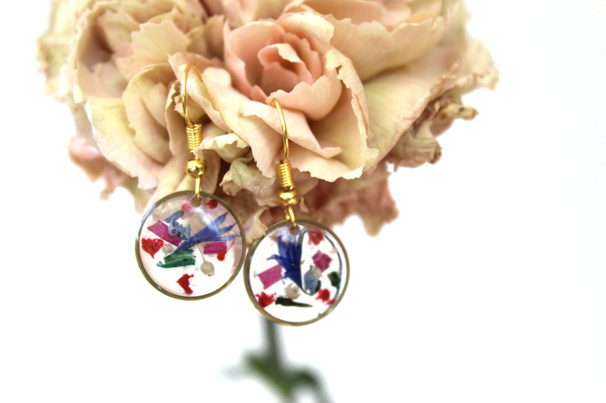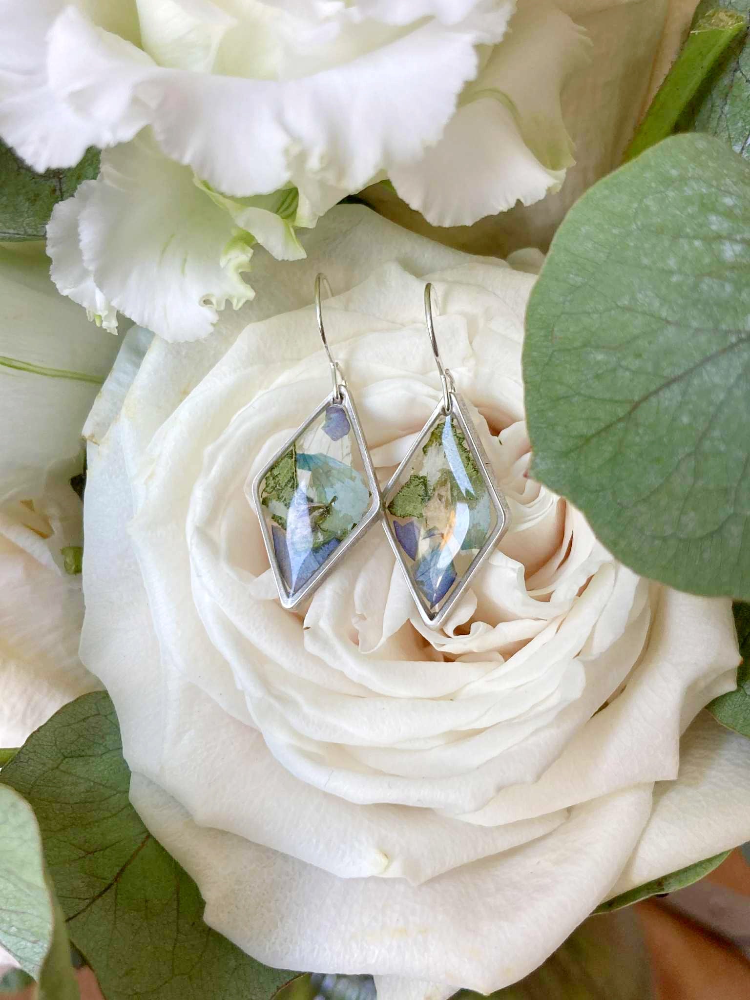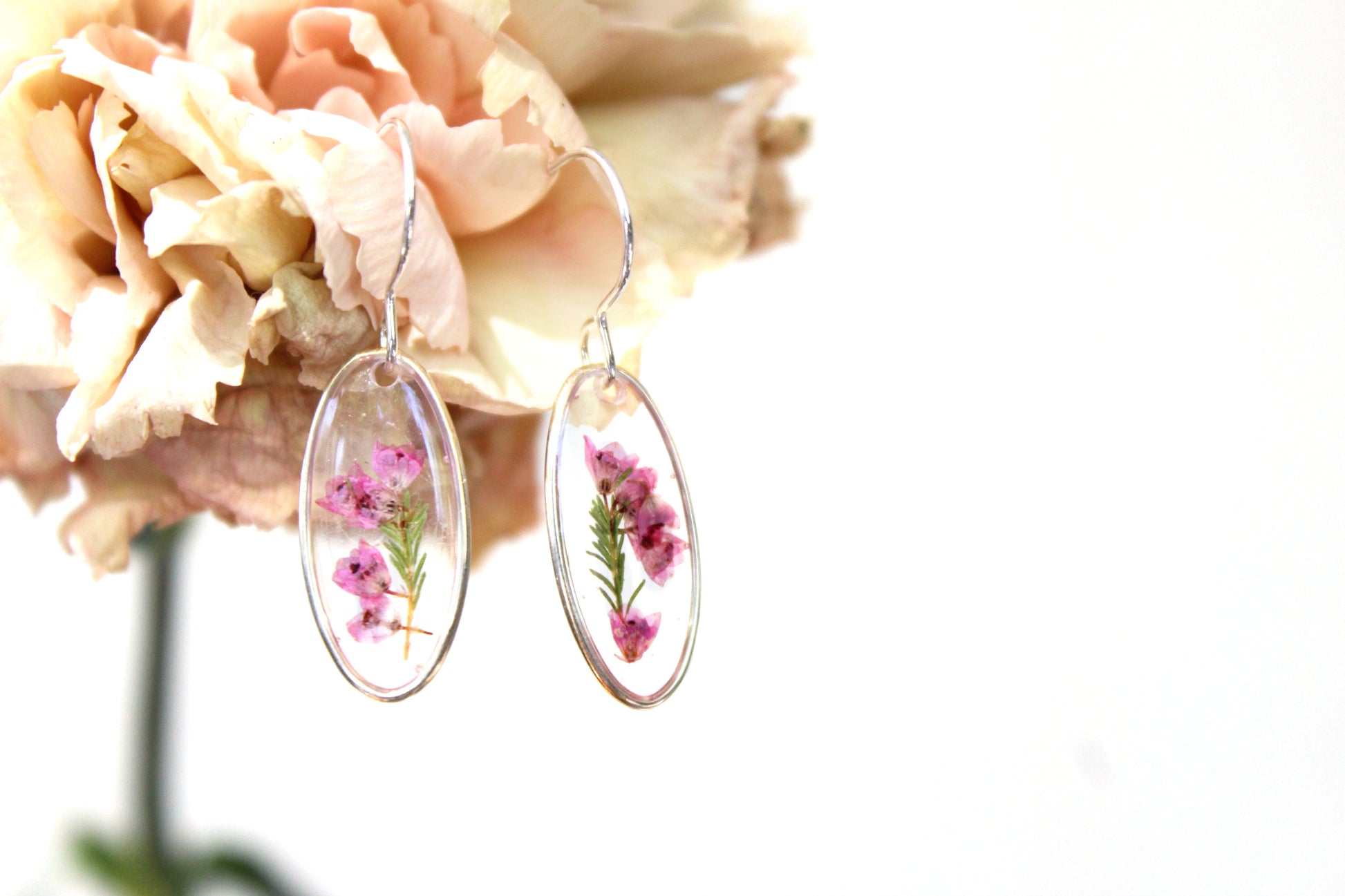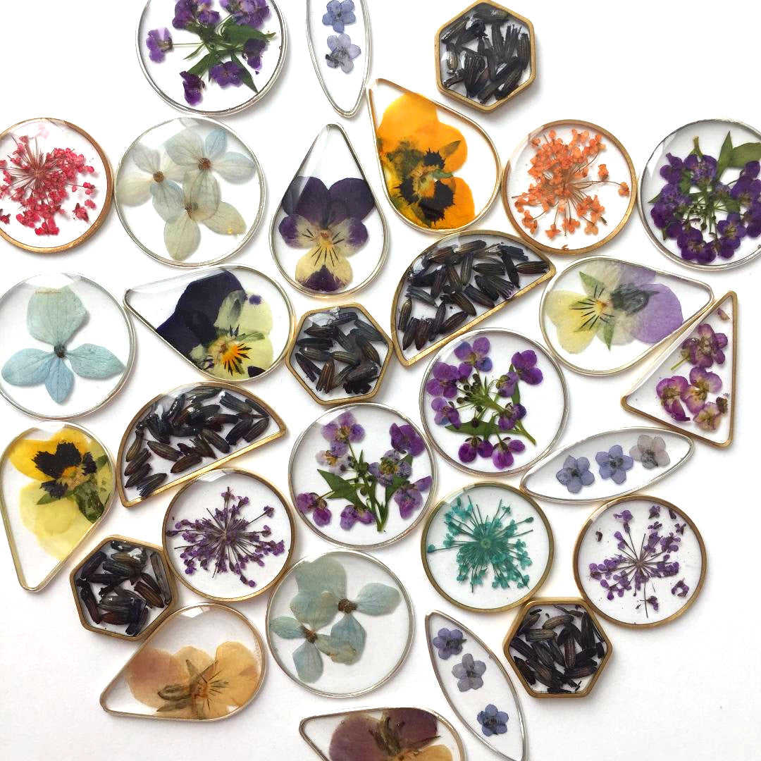 Personalisierter Schmuck aus deinen eigenen Blüten. Dazu werden kleine Stücke einzelne Blütenblätter getrocknet und in Kunstharz eingegossen.