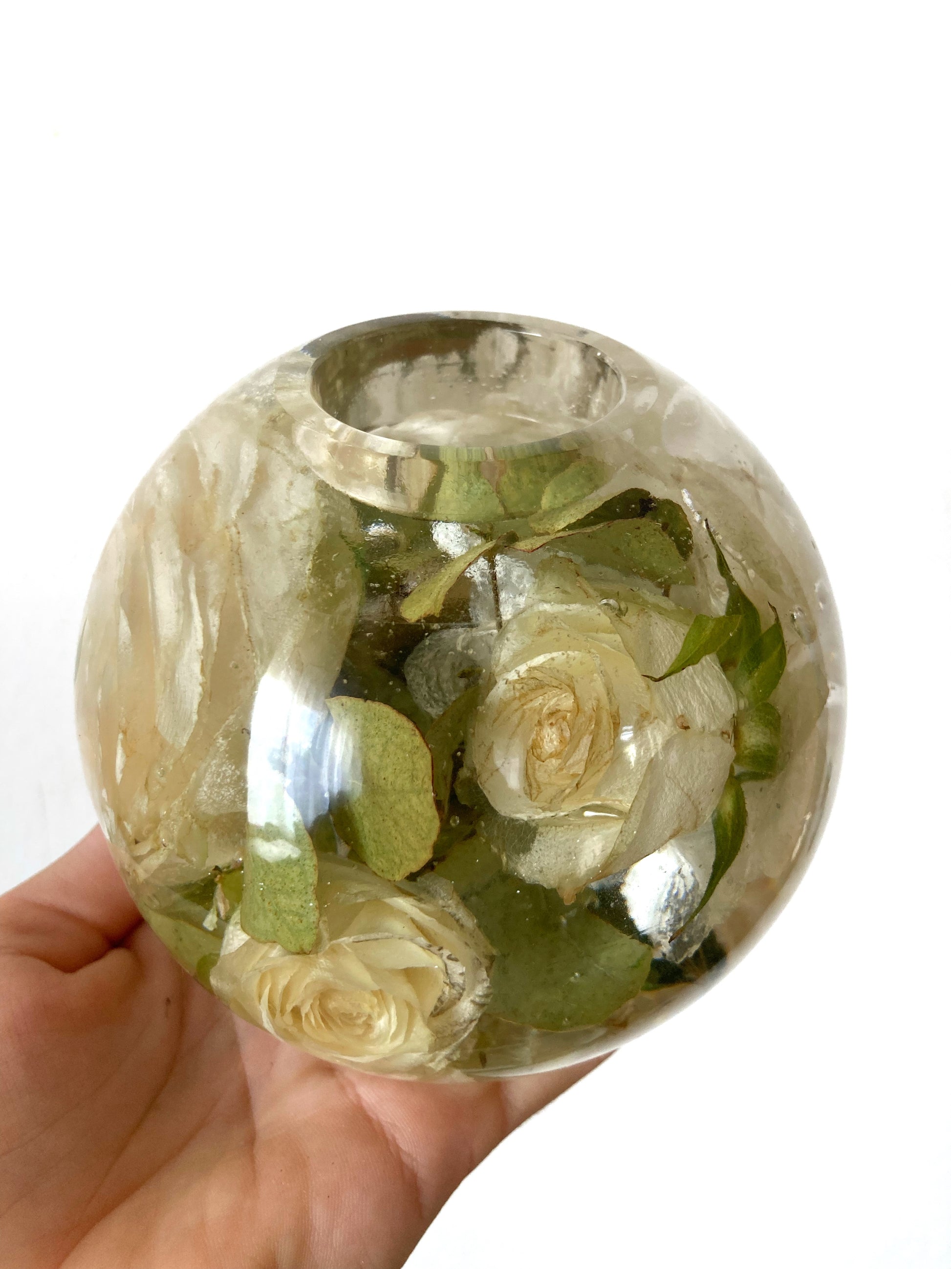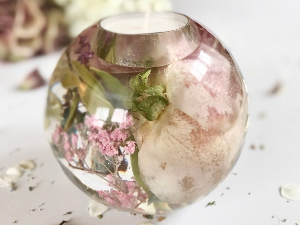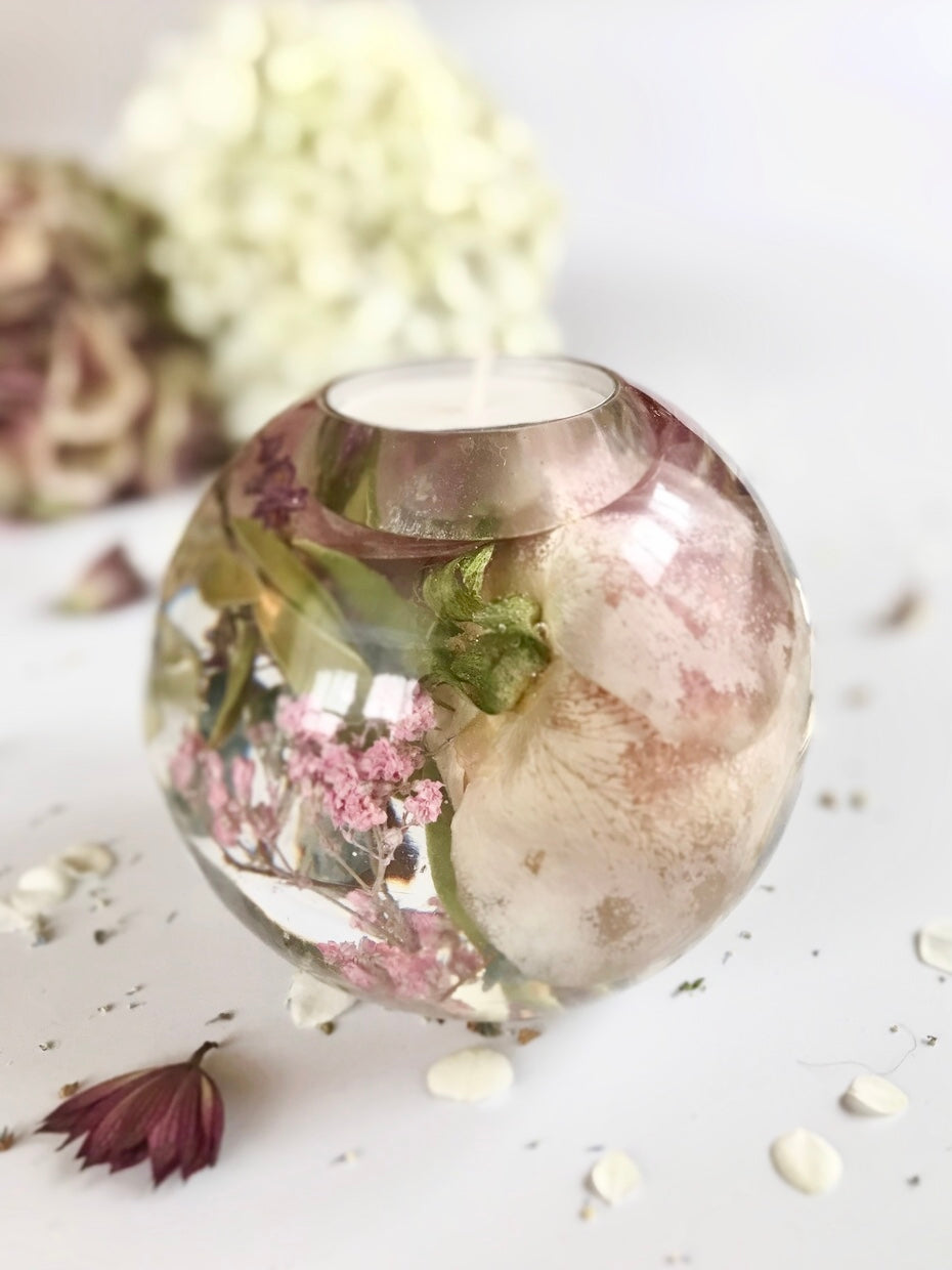Teelichthalter für ein Teelicht mit Blumen aus deinem Hochzeitsstrauß. Einzelne Blüten werden dazu sorgfältig getrocknet und in Kunstharz eingegossen. Bläschen können sichtbar sein.