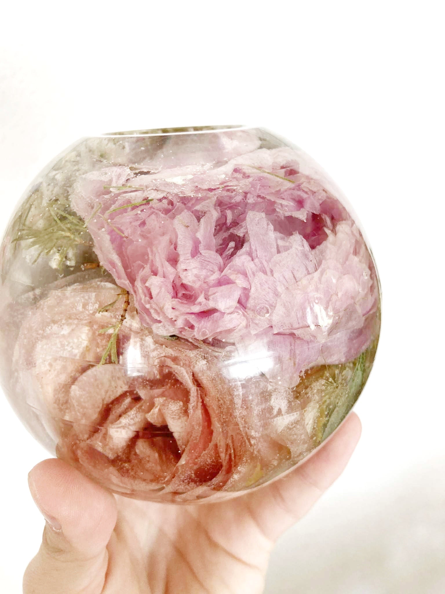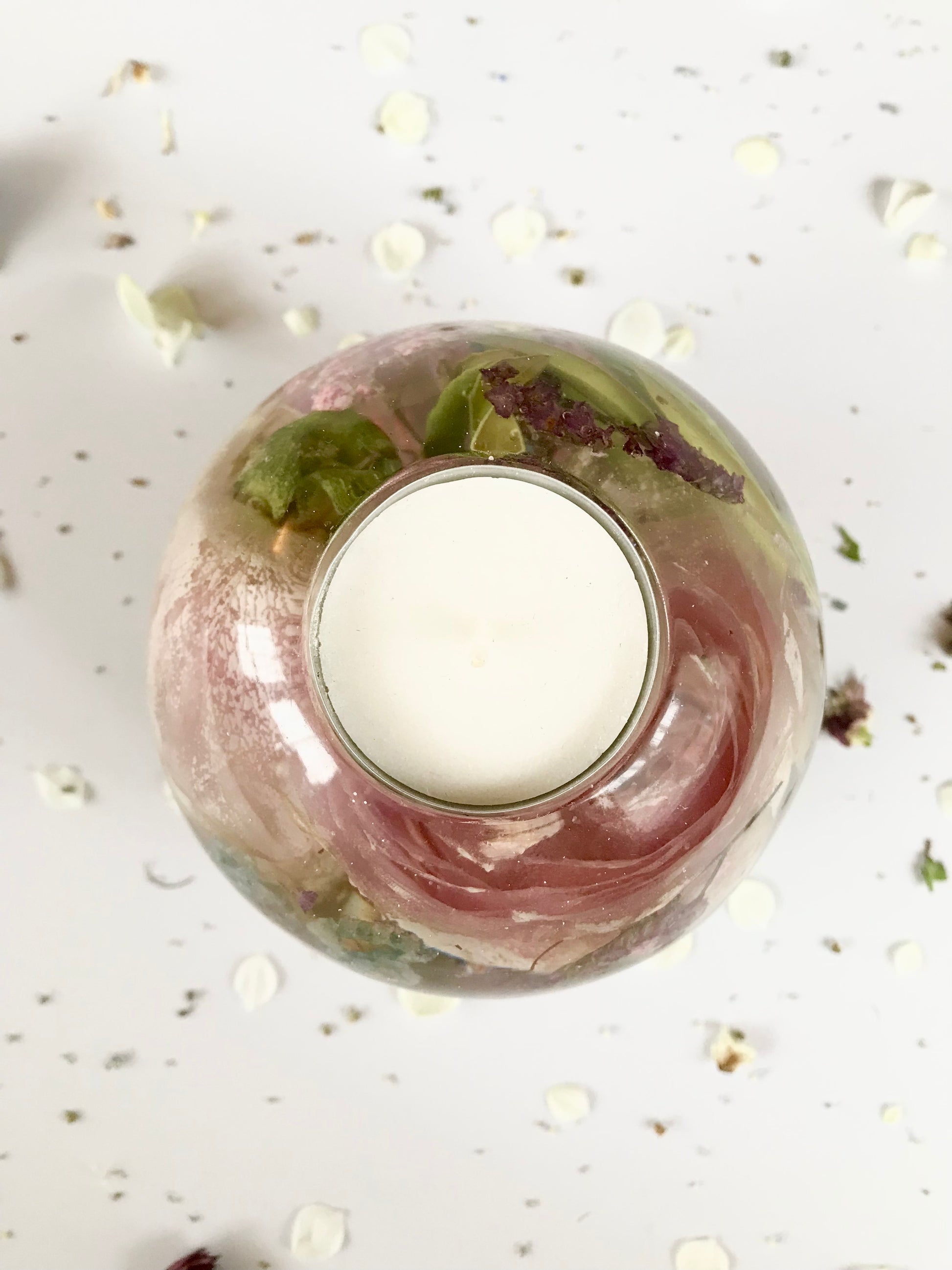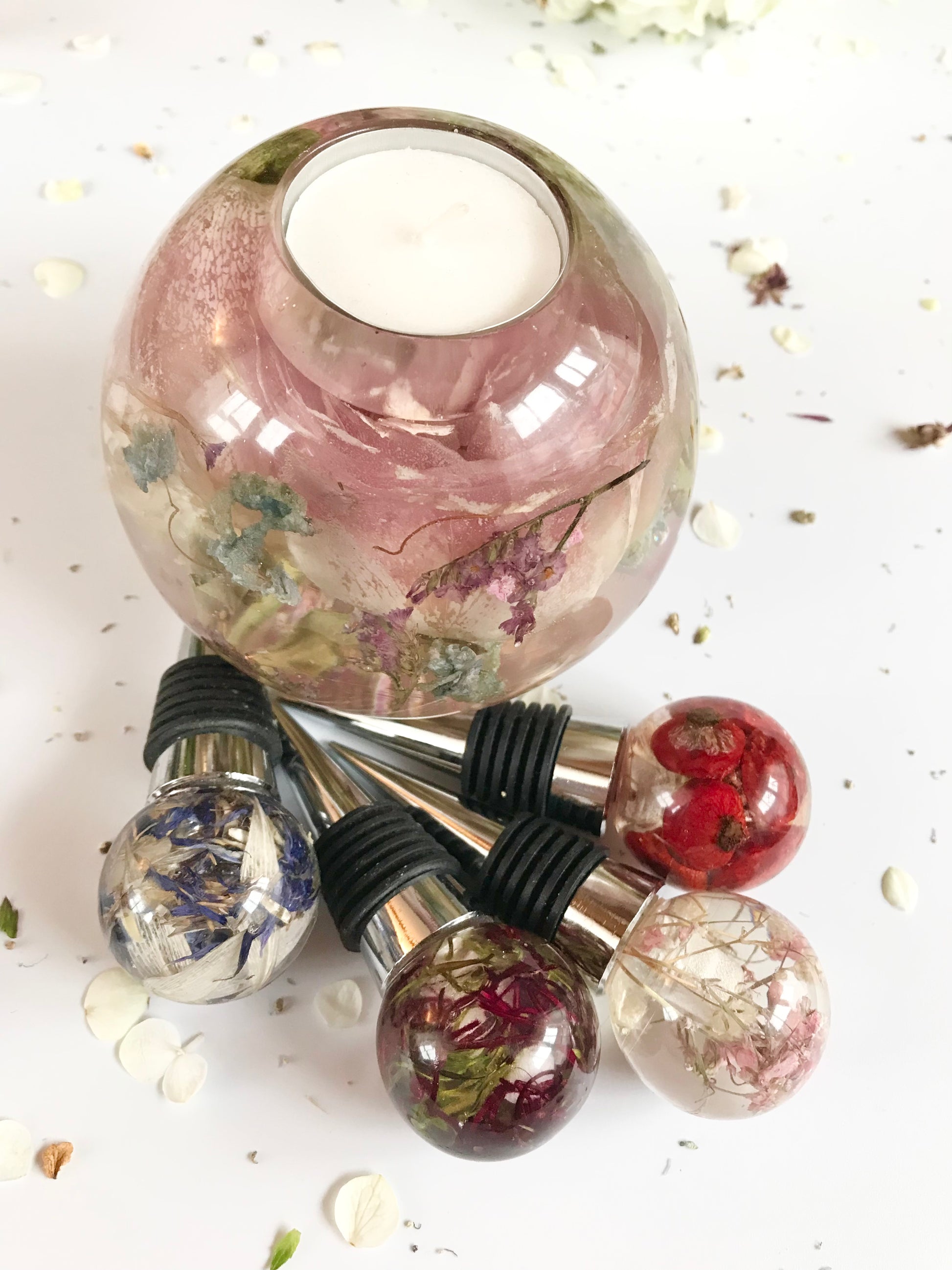 Teelichthalter für ein Teelicht mit Blumen aus deinem Hochzeitsstrauß. Einzelne Blüten werden dazu sorgfältig getrocknet und in Kunstharz eingegossen. Bläschen können sichtbar sein.